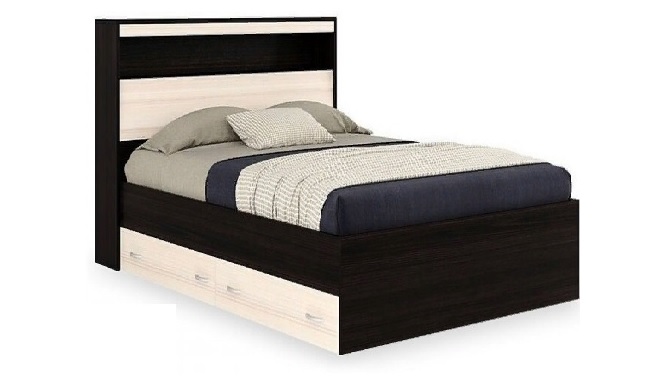 Двуспальная кровать выполнена из ЛДСП 16мм, цвета дуб честерфилд и бодега светлый. Кромка ПВХ.