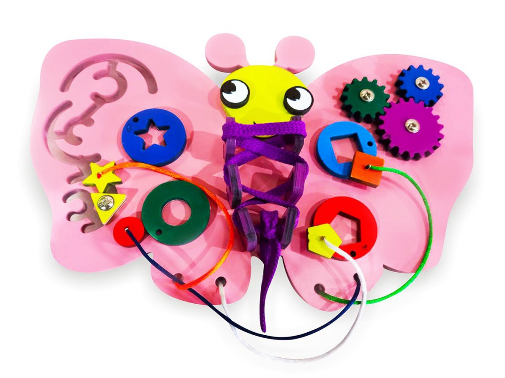 Бизиборд выполнен в виде модной бабочки. Бизипанель является отличным тренажером для раннего развития детей.