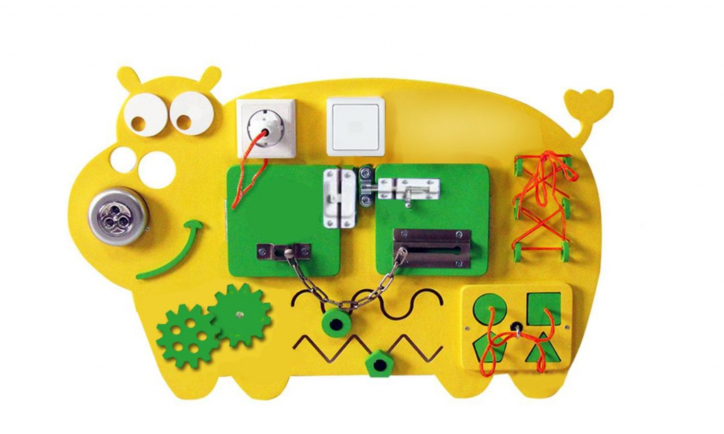Бизиборд выполнен в сочном лимонном цвете. Панель изготовлена в форме улыбчивого бегемота.