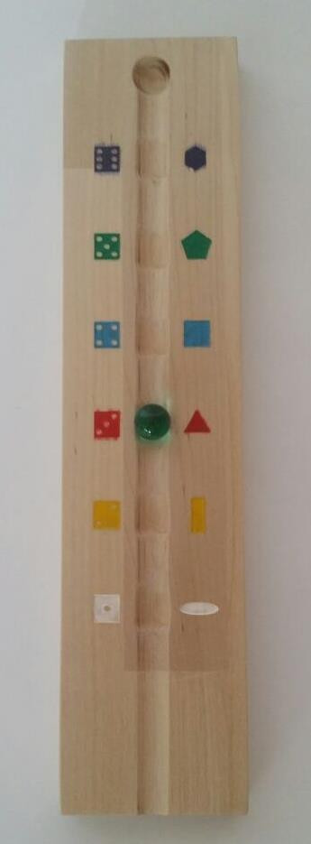 В центре деревянной основы имеется дорожка с шестью углублениями и отверстием для шарика в конце. Слева на основу нанесены игральные кости с точками (от 1 до 6). , справа от дорожки изображены геометрические фигуры разных цветов (по одной фигуре напротив каждого квадрата).