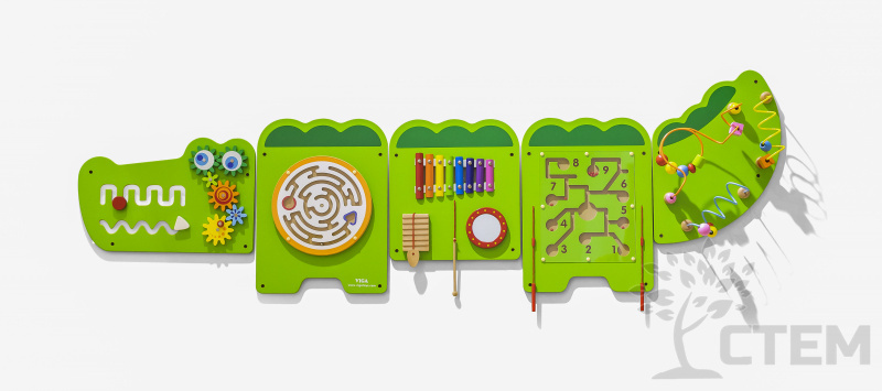 Комплект стеновых панелей "Крокодил" способствует развитию мелкой моторики и координации движения, развивает пространственное мышление, коммуникативные навыки, логическое мышление и звуковое (музыкальное) восприятие.