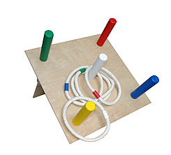 Платформа кольцеброса изготовлена из высококачественной фанеры, покрыта лаком, столбики ― из экологически чистой древесины, окрашены яркими водными красками разных цветов. Изделие тщательно отшлифовано вручную и имеет приятную на ощупь поверхность.