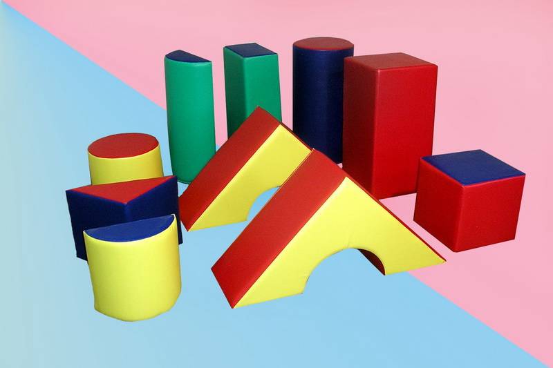 Планка 50*25*15-1шт, Цилиндр-h-25, d-25-1 шт, Цилиндр h-50, d-25-1шт, 1/2 цилиндра h-25,d-25-1шт, 1/2 цилиндра h-50, d-25-1шт, Брусок 50*25*25-1шт,треугольник 25*25*25-1 шт, Треугольная призма с вырезом 50*50*25-2шт, Куб 25*25*25-1 шт