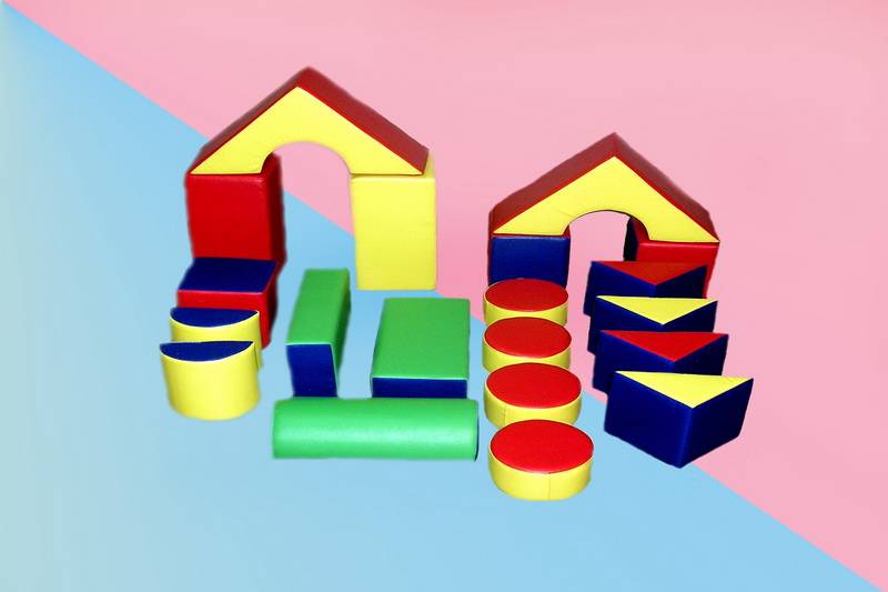 Планка 40*20*10-2 шт, Цилиндр h-10, d-20-4 шт, 1/2 цилиндра h-20,d-20-2 шт, 1/2 цилиндра h-40,d-20-1шт, Брусок 40*20*20 -2шт, треугольник 20*20*20-4шт, Треугольная призма с вырезом 40*40*20-2шт, Куб 20*20-3 шт