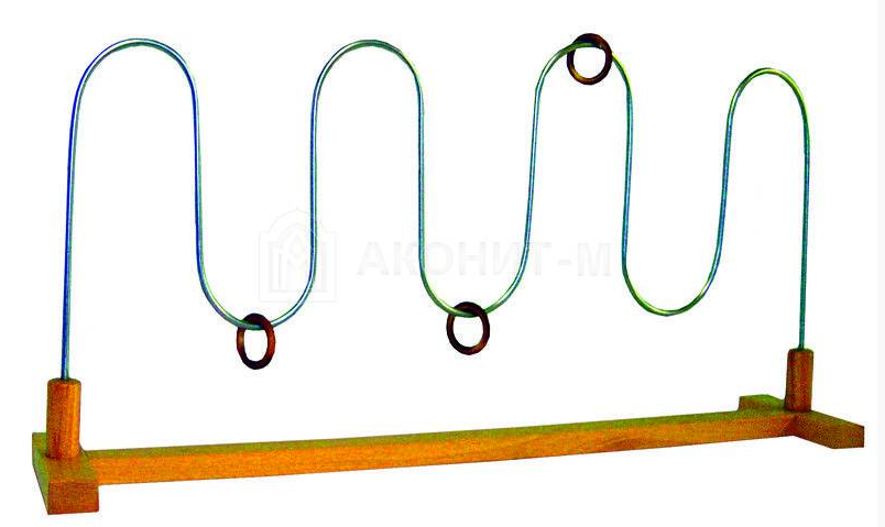 Назначение: восстановление мелкой моторики и координации движений у пациентов с порезами, контрактурами, гипотрофией мышц верхней конечности. Основные элементы конструкции: деревянная подставка и волнообразный или ступенеобразный металлический стержень. На стержень нанизаны 3-6 деревянных колец диаметром 5 см. Стержень является направляющей опорой для перемещения колец.