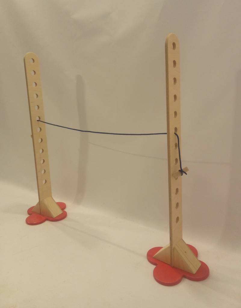 Сборная конструкция, состоящая из двух вертикальных стоек с горизонтальной веревкой яркого цвета длиной 3 м (заменяет жесткую планку). Стойка выполнена из фанеры, покрытие лак. На стойке 12 вертикальных отверстий для перестановки веревки. Диаметр опорных площадок стоек - 24 см, высота стойки 80 см