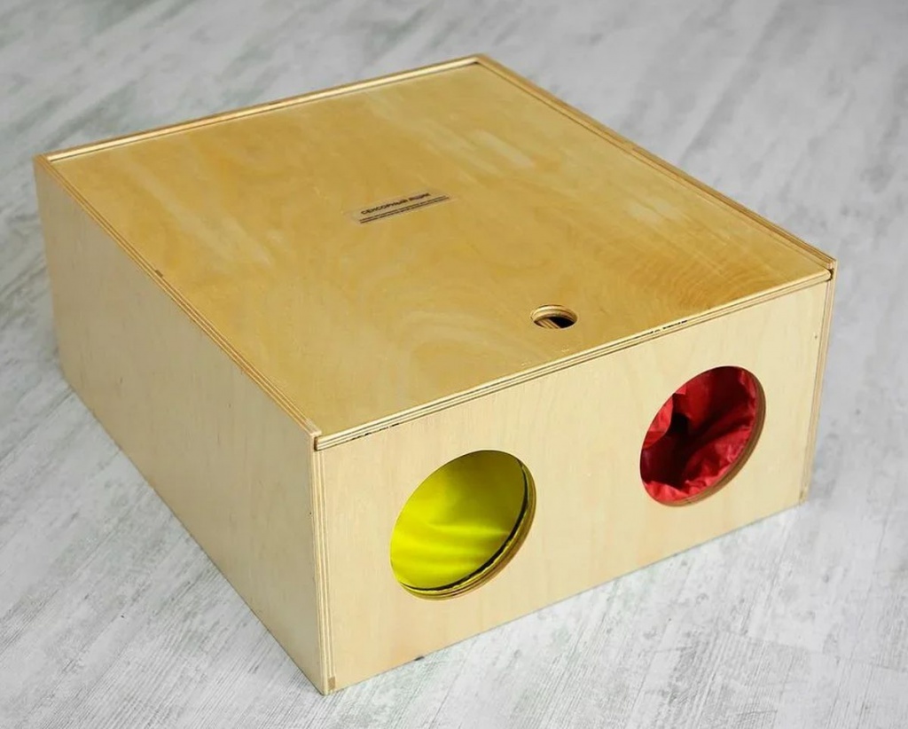 Конструкция представляет собой большой квадратный короб, внутри которого есть четыре отделения, ограниченные перегородками. В каждое отделение можно проникнуть рукой через круглое отверстие. С двух противоположных сторон короба есть по два отверстия. Доступ к внутреннему пространству возможет и через съемную крышку.