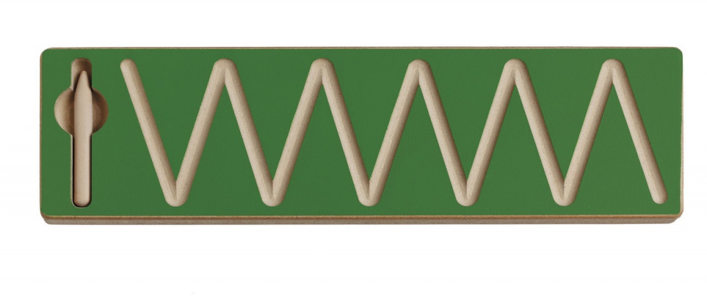 Доска с повторяющимися элементами и деревянным "карандашом" (длина 7,9 см, диаметр 1 см) способствует подготовке руки к рисованию и письму, развитию моторики кисти руки, зрительно-моторной координации, наблюдательности, пространственного мышления и зрительного восприятия.