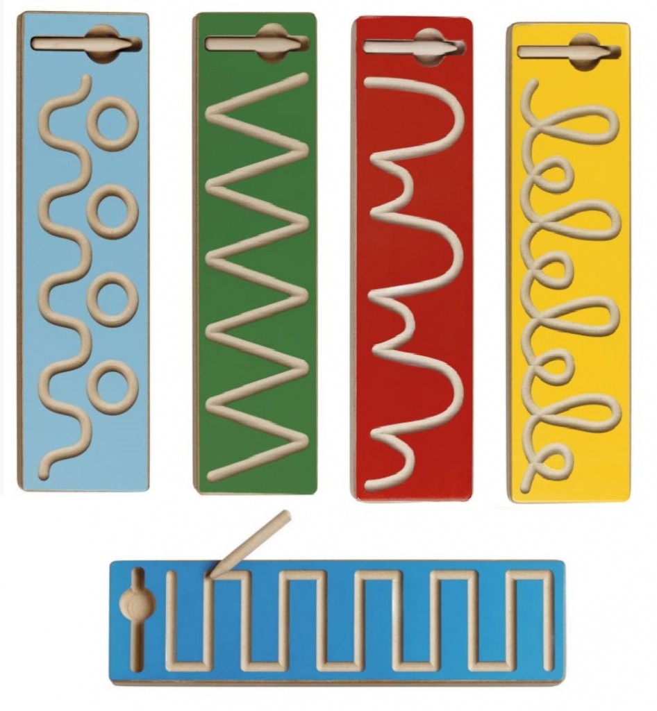 Набор досок из 5 досок с повторяющимися элементами и деревянным "карандашом" (длина 7,9 см, диаметр 1 см) способствует подготовке руки к рисованию и письму, развитию моторики кисти руки, зрительно-моторной координации, наблюдательности, пространственного мышления и зрительного восприятия.