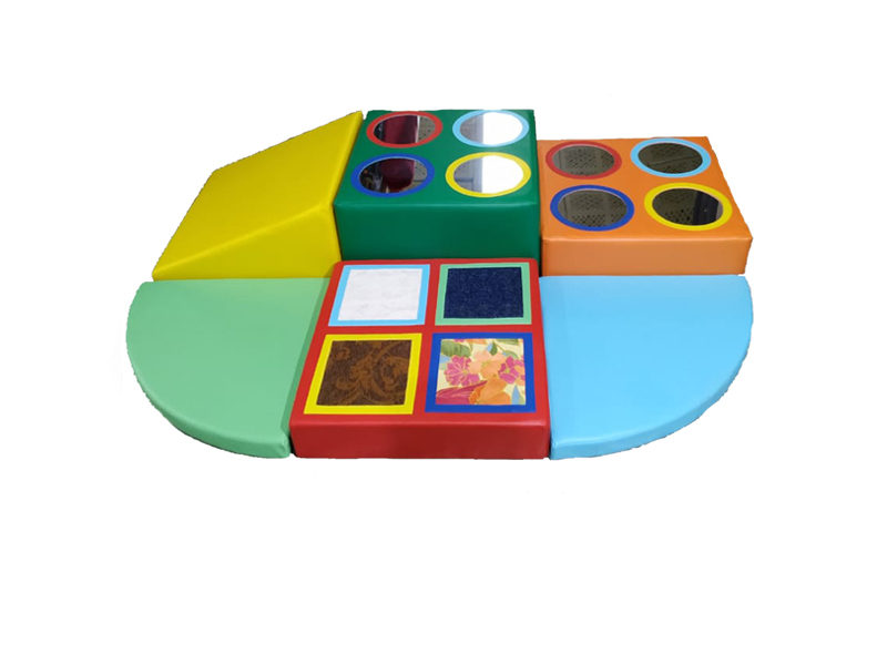 Параллелепипед с безопасными зеркалами 50*50*25 -1шт, горка 50*50*25- 1шт, параллелепипед с безопасными зеркалами 50*50*15 - 1шт, параллелепипед с тканями разной шероховатости 50*50*10см- 1шт, мат-сектор r-50см, h-5см. – 2шт.