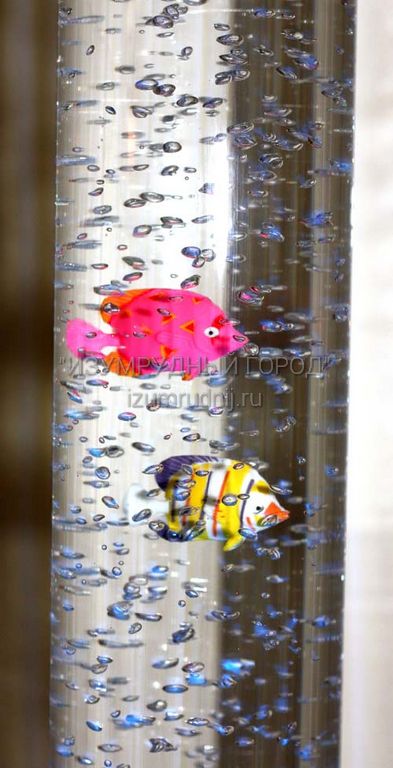 Питание: сеть 220В. Подсветка светодиодная разноцветная, разные режимы переключения подстветки с помощью пульта ДУ: переключение цветов, фиксация одного цвета, мерцание, изменение яркости. Высота колонны: 150см, Диаметр: 10см. Выполнена из пластикового акрилового стекла, Основание - пластик. В комплекте набор пластиковых рыбок.